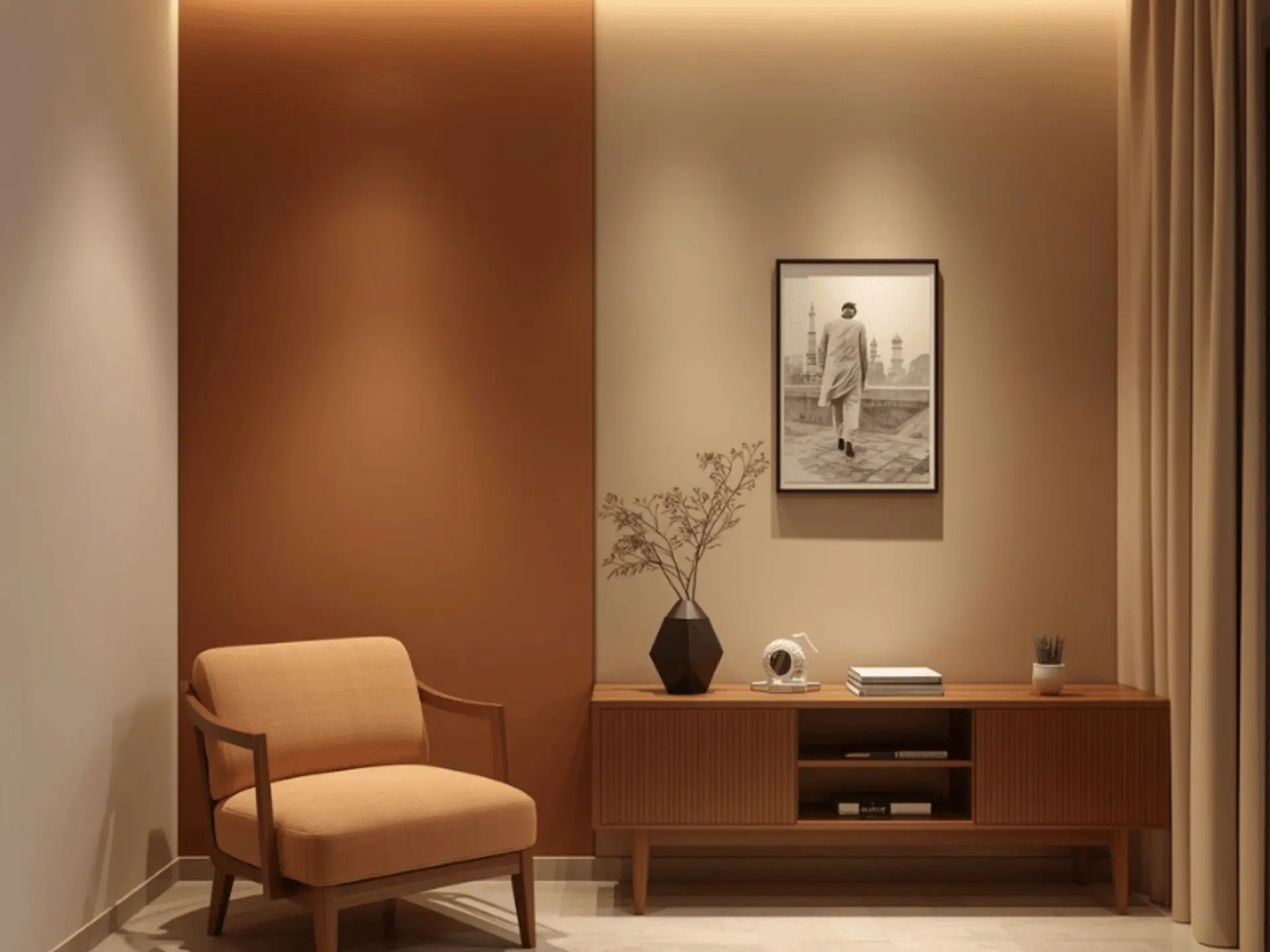 A two-tone split adds depth and makes small rooms feel organised. It pairs well with simple furniture and works for modern room paint design in flats and homes alike.