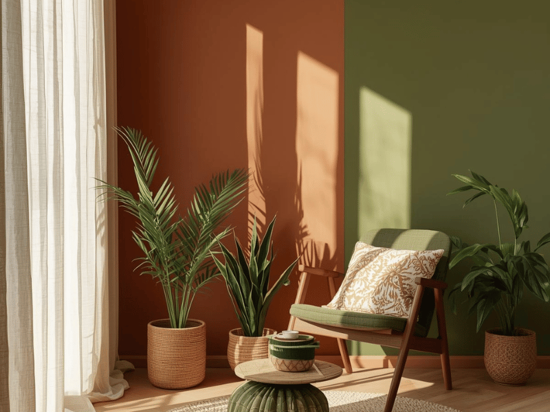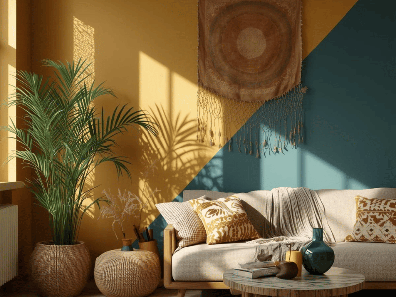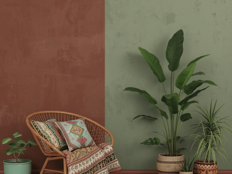 Colour pairing is where boho wall paint becomes expressive. Use these combinations on one accent wall, a niche, or a half-wall behind shelves. They also work with handmade boho décor ideas like cane lamps, jute rugs, pottery, and framed prints.