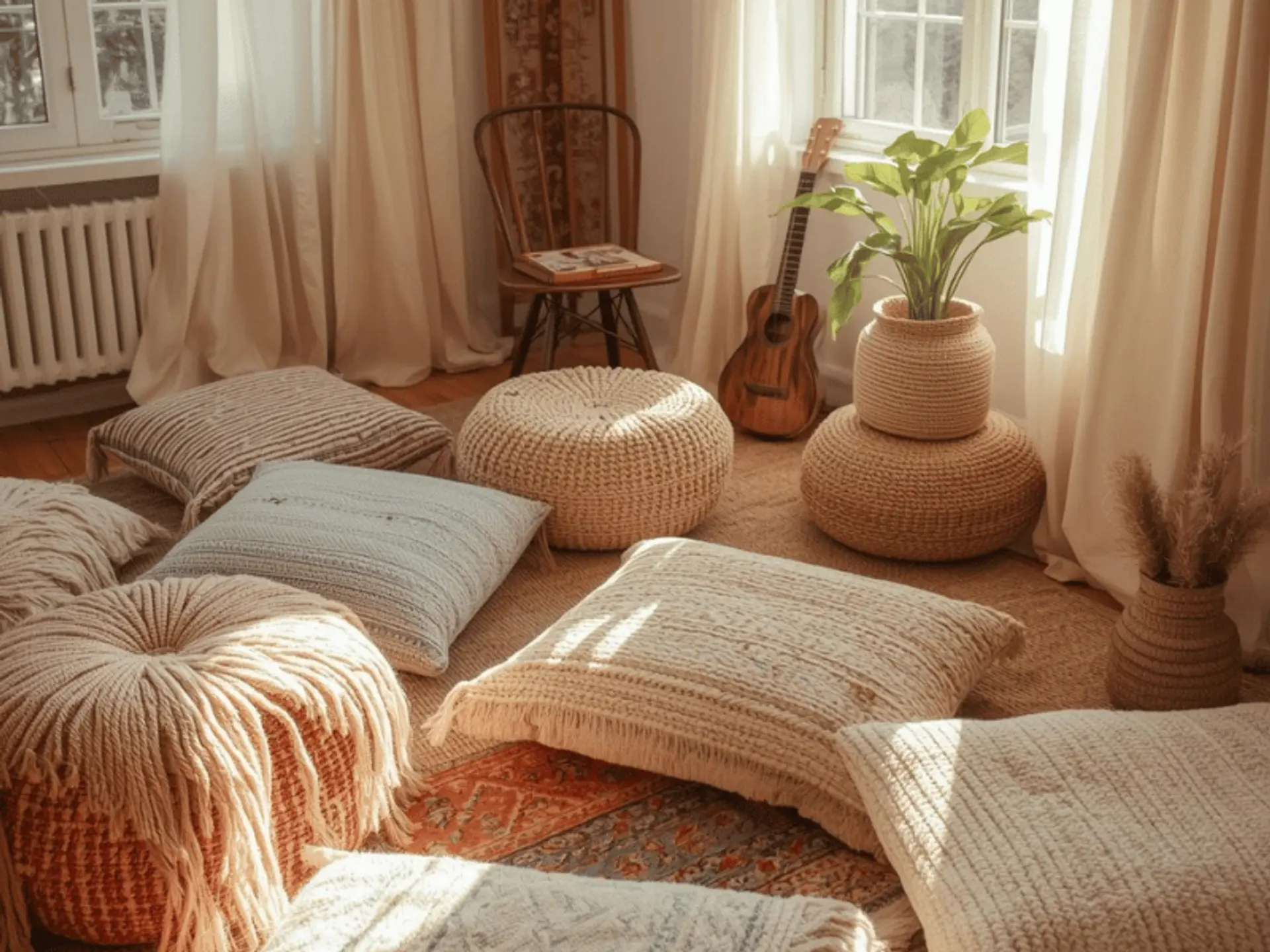 Once colours are set, furniture and materials bring the room together. In a boho space, texture matters as much as shade, so choose natural finishes and simple shapes. Keep your colour palette tight so the room feels layered, not random.