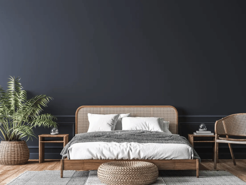 Dark shades do not always make a room feel small. A single charcoal or deep navy wall adds depth and frames the bed. When the other walls and ceiling stay light, the room feels balanced and intimate.