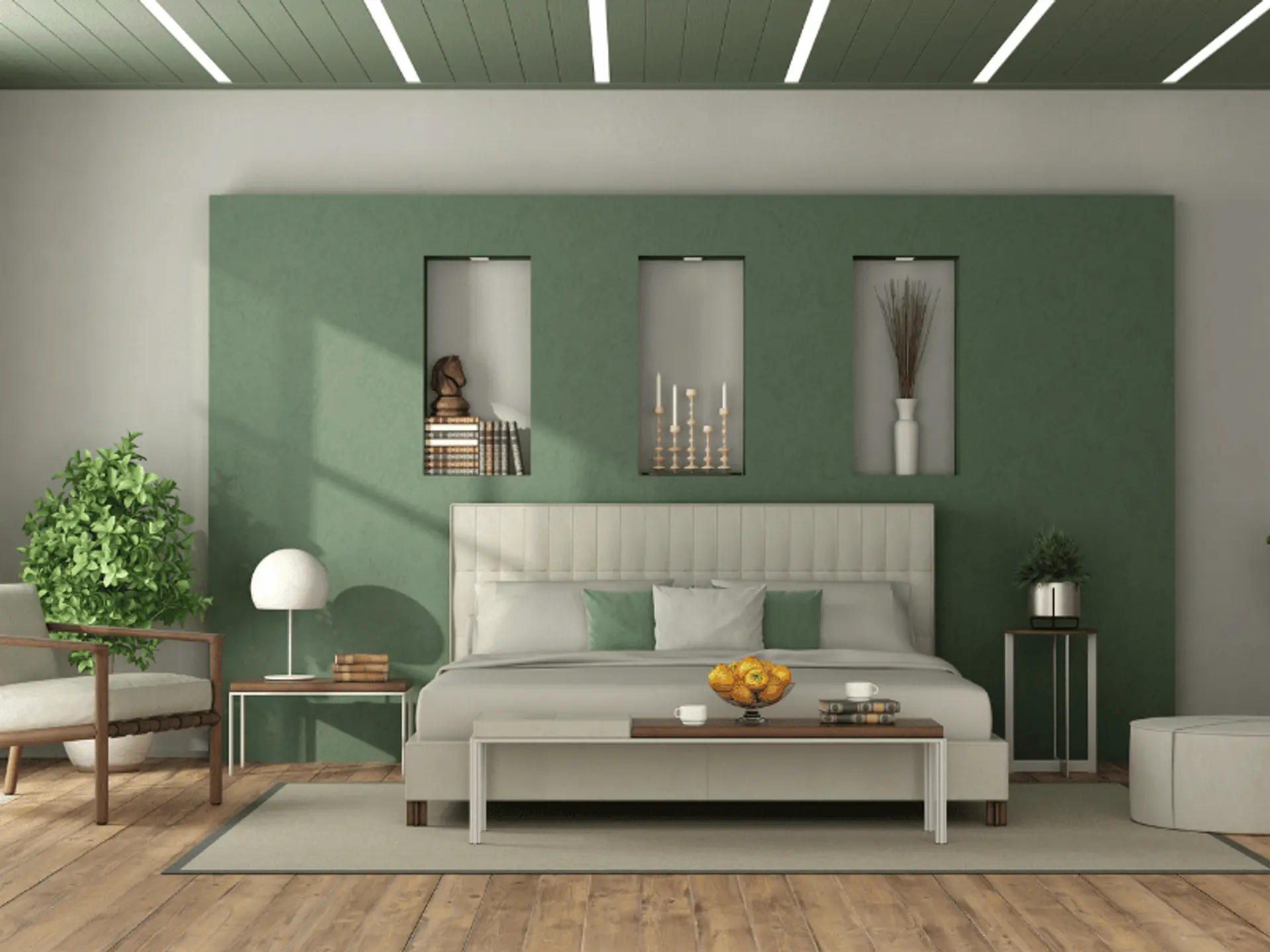 - Olive feature wall with beige bedding and walnut side tables.