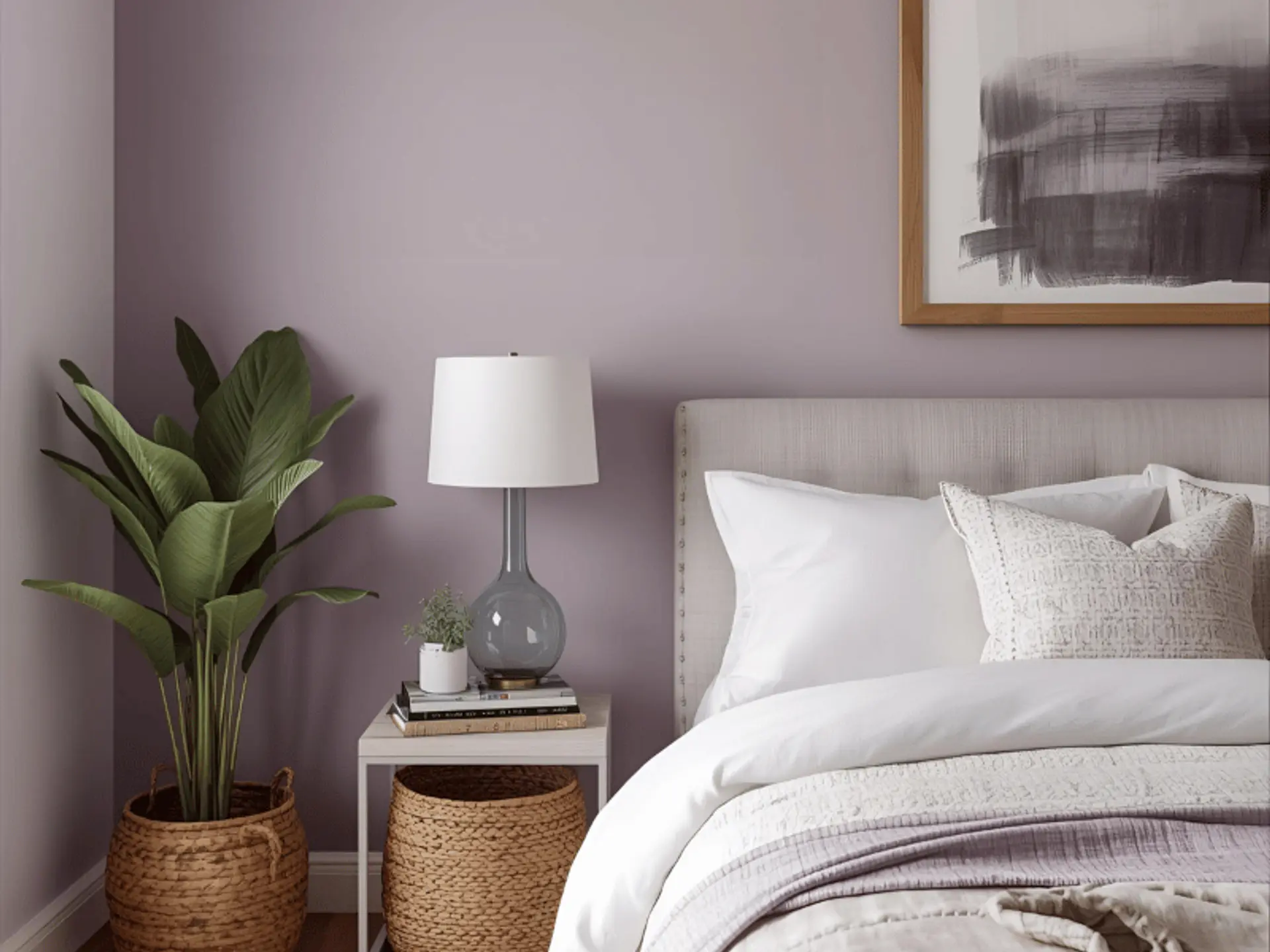 - Pale lavender walls with ivory bedding and rose gold lamps.