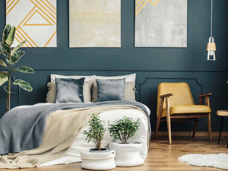 - Deep navy behind the bed with warm white side walls and gold lamps.