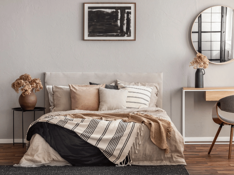Soft neutrals are a safe starting point when tastes differ. Beige and greige offer warmth, while warm white keeps the room airy. These shades sit quietly behind the furniture and allow bed linen, cushions and art to do the talking. They also work well with both wood and metal finishes.