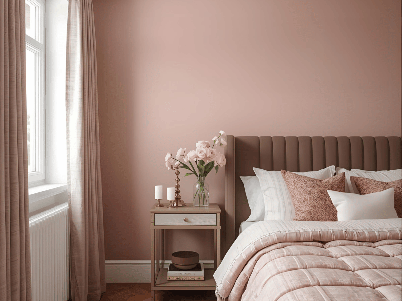 Dusty rose blends the warmth of pink with quiet grey undertones. It feels grown-up and calm rather than bold. Couples who want romantic bedroom colours without a loud statement often enjoy this shade.