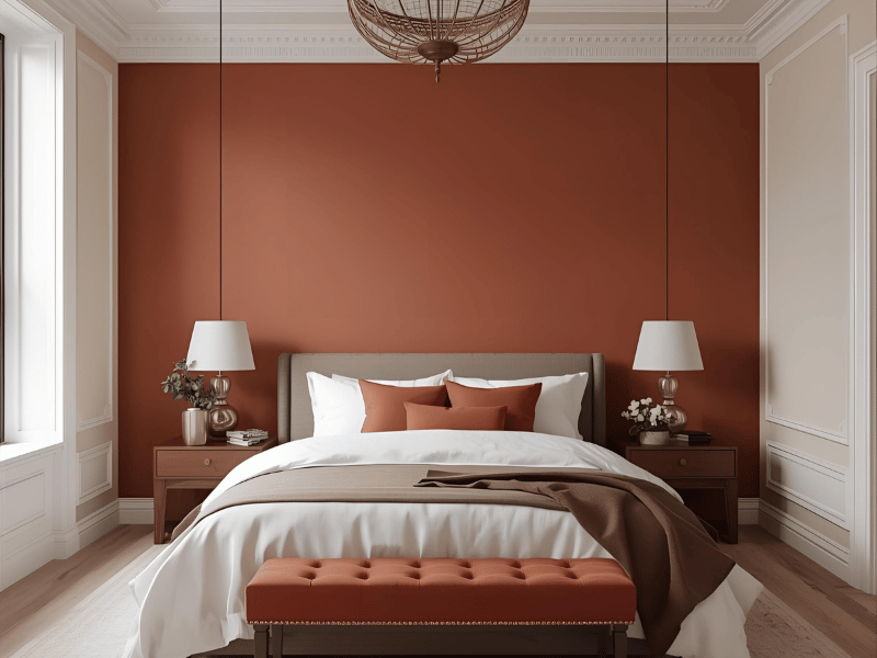 Terracotta, clay and muted cinnamon bring the feel of sun baked earth and old courtyards. These tones look rich in warm lighting and are ideal for couples who enjoy a cosy, grounded space. Use them as a feature wall or across the room if the space gets ample light.