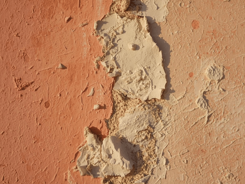 Moisture trapped under the paint film forms blisters as temperatures change throughout the day. Once blisters break, the film peels and flakes. If dampness is ongoing, patch repairs fail again because moisture continues to move through the wall.