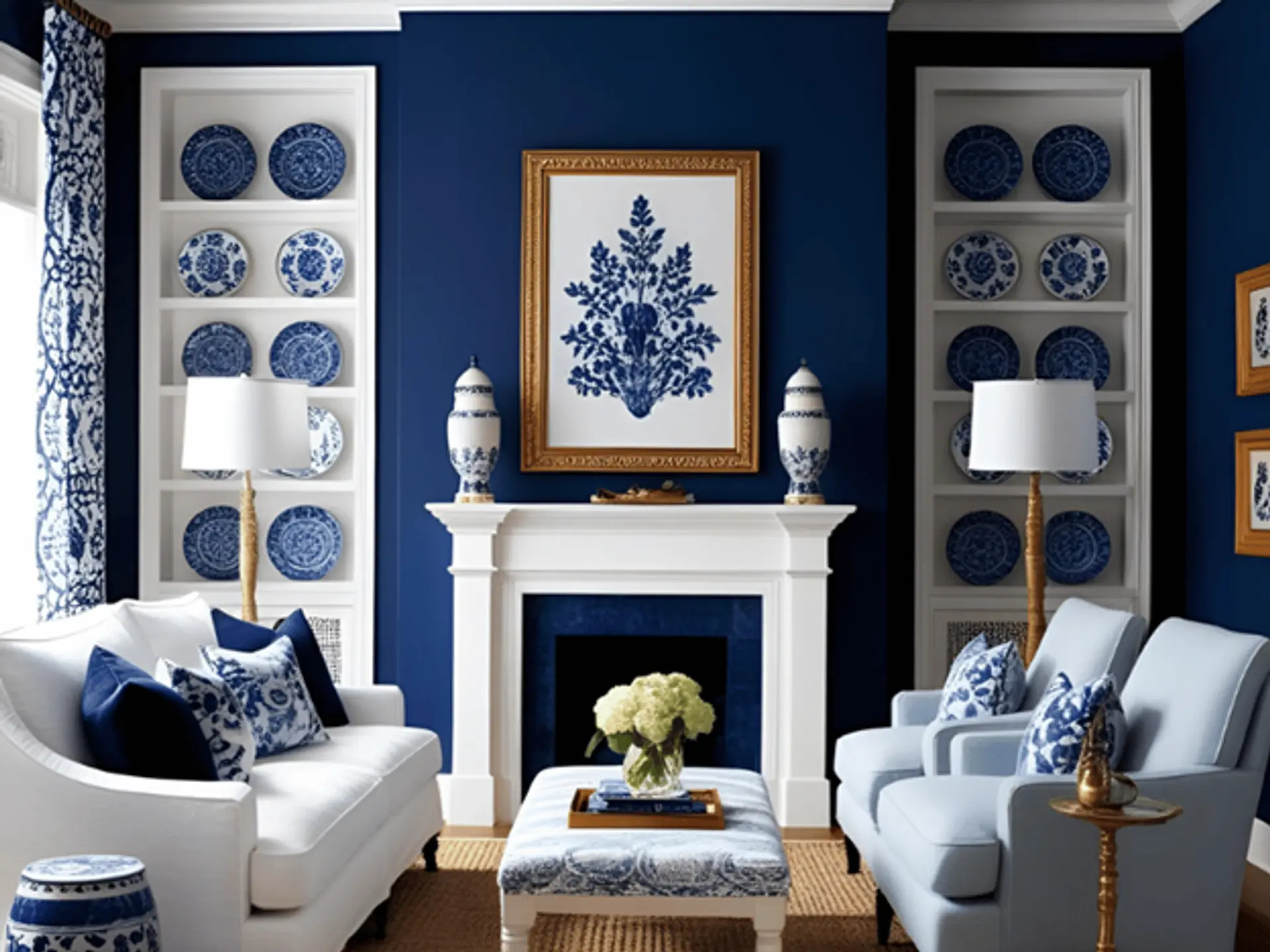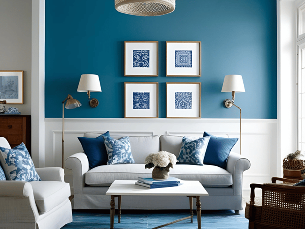 One of the most elegant wall paint shades, this combination enhances depth and warmth. Deep blue brings a luxurious feel, while gold accents add richness, perfect for a grand and artistic space.