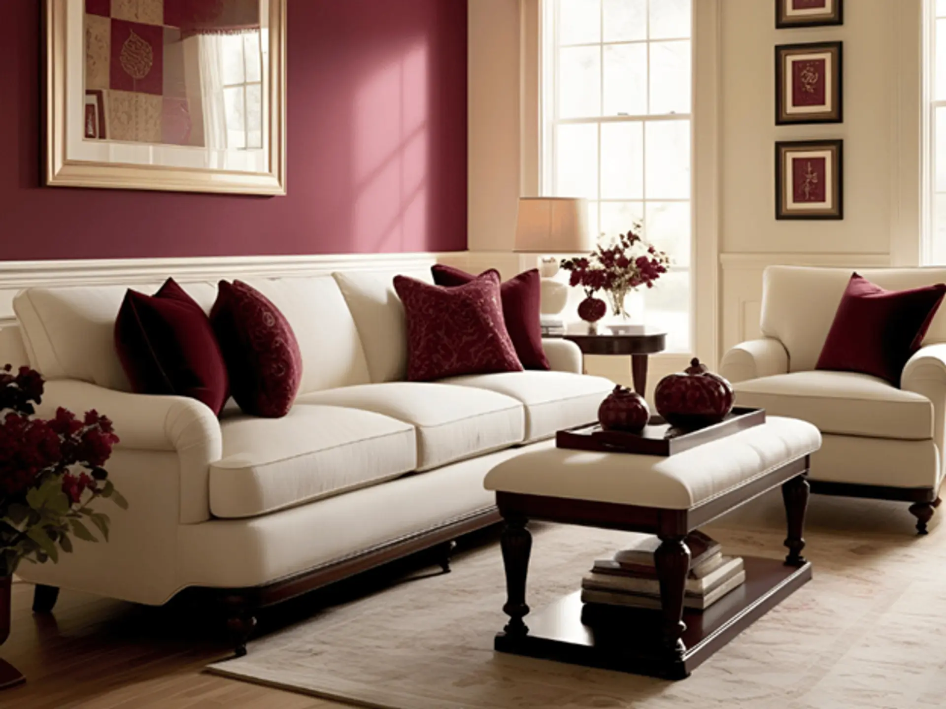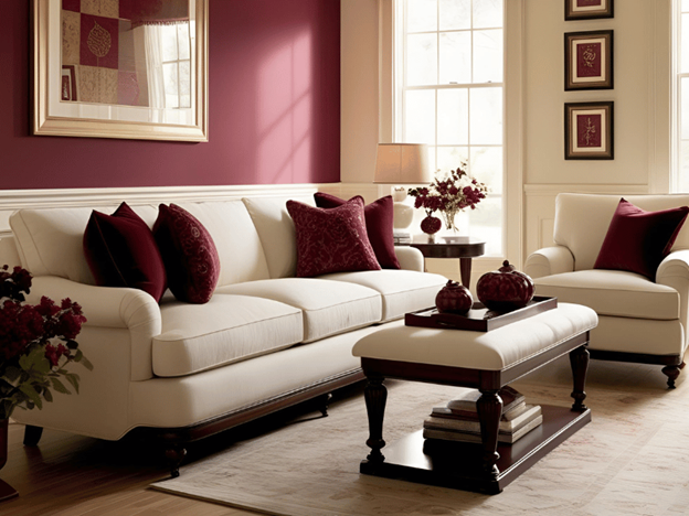 This regal wall colour combination for hall exudes sophistication. Burgundy adds depth, while ivory balances it out, making it a simple Indian hall colour combination with a luxurious feel.