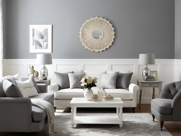 This neutral wall colour combination for hall adds an airy and sophisticated feel. Light grey provides a chic, modern backdrop, while white enhances brightness, making the space look expansive and elegant.