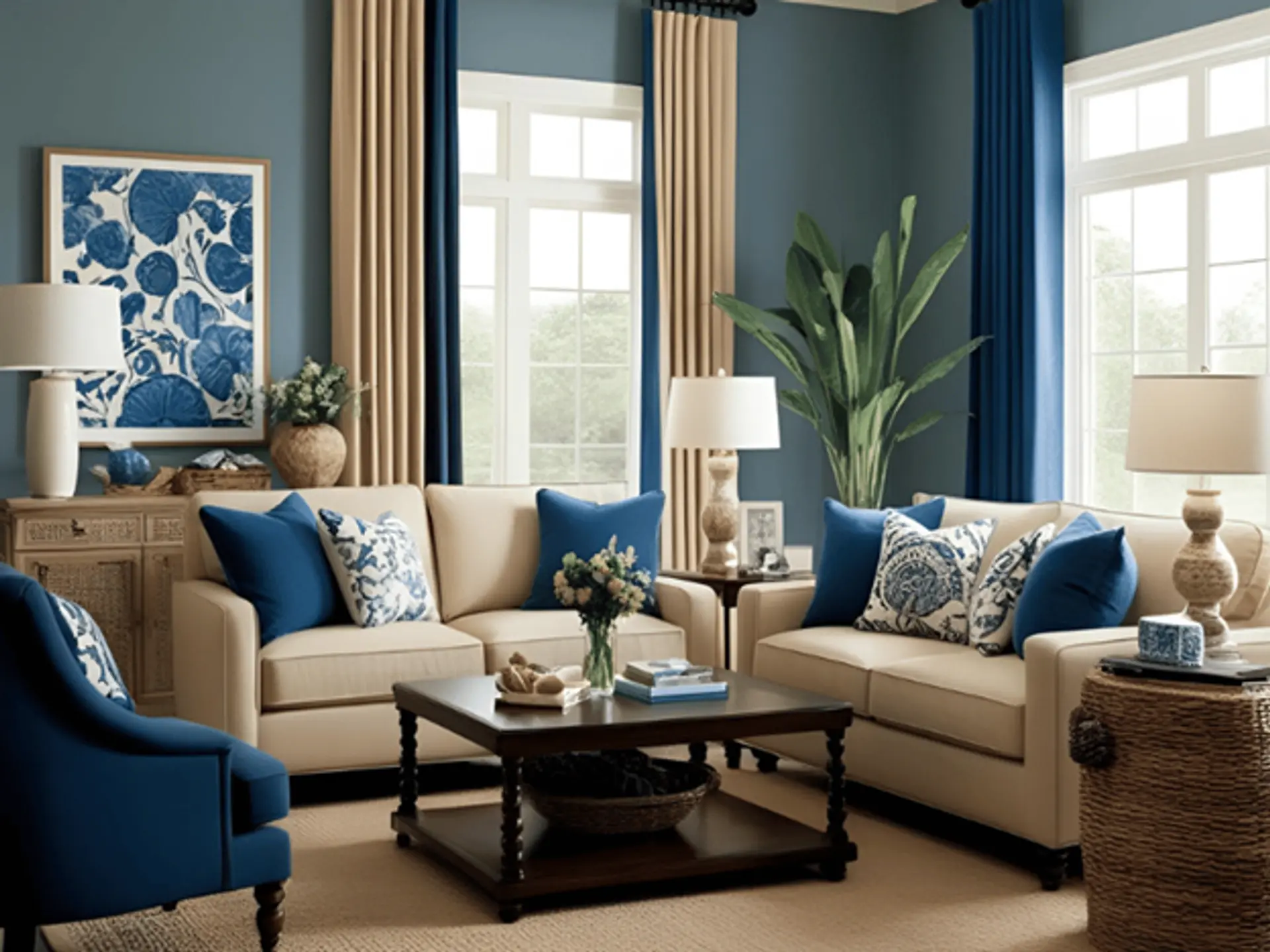 This soothing best colour combination for hall brings together warmth and serenity. Beige provides an inviting base, while blue adds a touch of freshness, perfect for a contemporary setting.