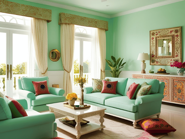 A fresh and lively wall paint colour combination for hall, mint green symbolises prosperity, while ivory keeps the look balanced. This is an ideal choice for a calming, nature-inspired Indian theme.