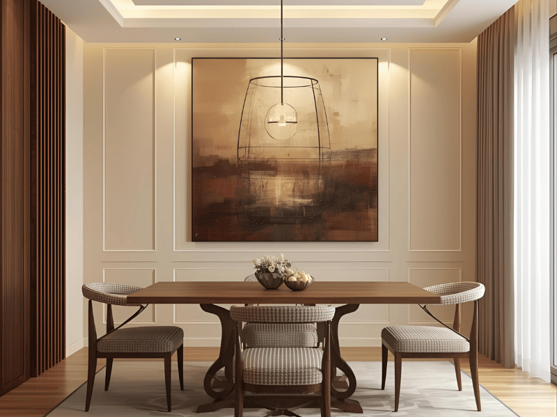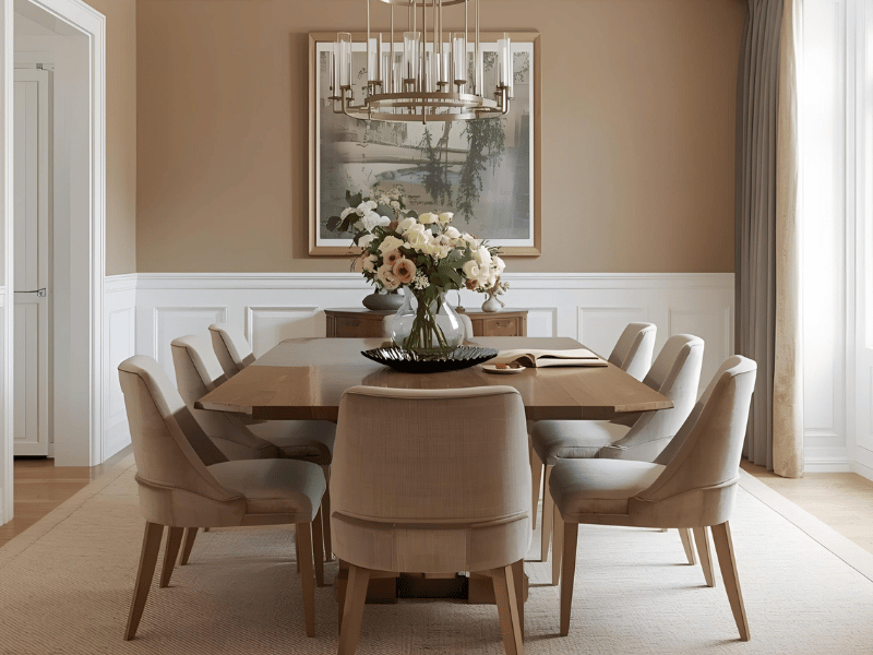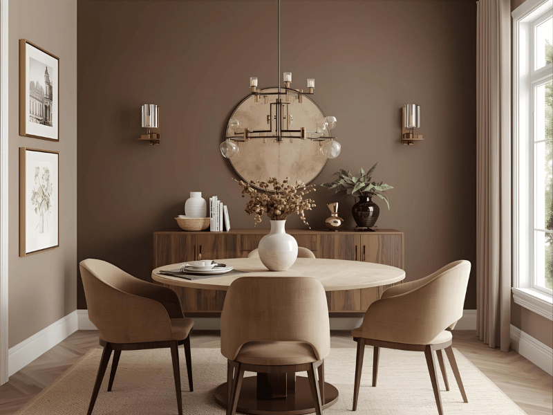 Mocha walls with beige trims build a warm, intimate setting. This is one of the best dining room colours for families who enjoy cosy dinners. Add soft lighting, linen table runners, and woven placemats for texture. The contrast is gentle and timeless, perfect for Indian wood tones like Sheesham.