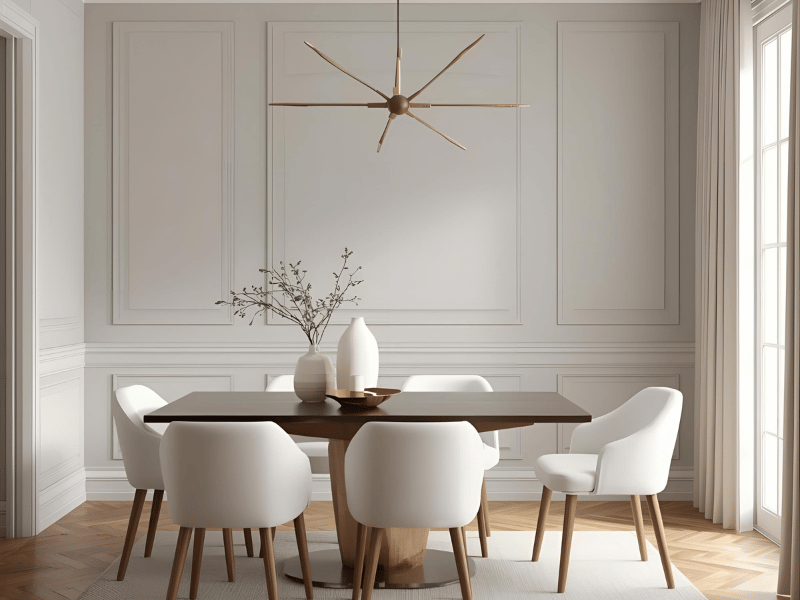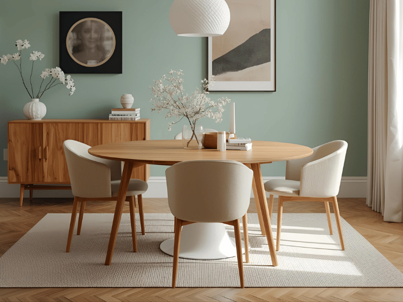 Neutral beige for the main walls with a green accent wall is a simple way to introduce nature into your dining room ideas. Pick a botanical green, sage, leaf green, or a muted forest tone. It pairs well with garden views or balcony doors. Cane accents, potted plants, and light wood textures highlight this soothing mix.
