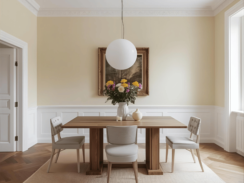 This soft neutral pairing creates a calm dining space. Light grey brings a modern touch, while cream adds warmth. If you love a refined setting with clean-cut tableware and glass, this is one of the most popular dining room colours. Use black and wood accents for contrast and depth.