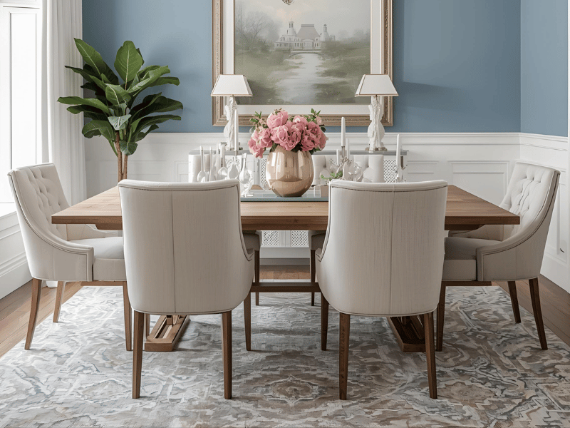 Airy and peaceful, sky blue with off white keeps the room breezy. It suits homes that prefer a relaxed, coastal feel. Add cane, cotton, and soft blue ceramics for a harmonious look. A sky blue accent wall behind a bench seat or buffet unit adds gentle character.