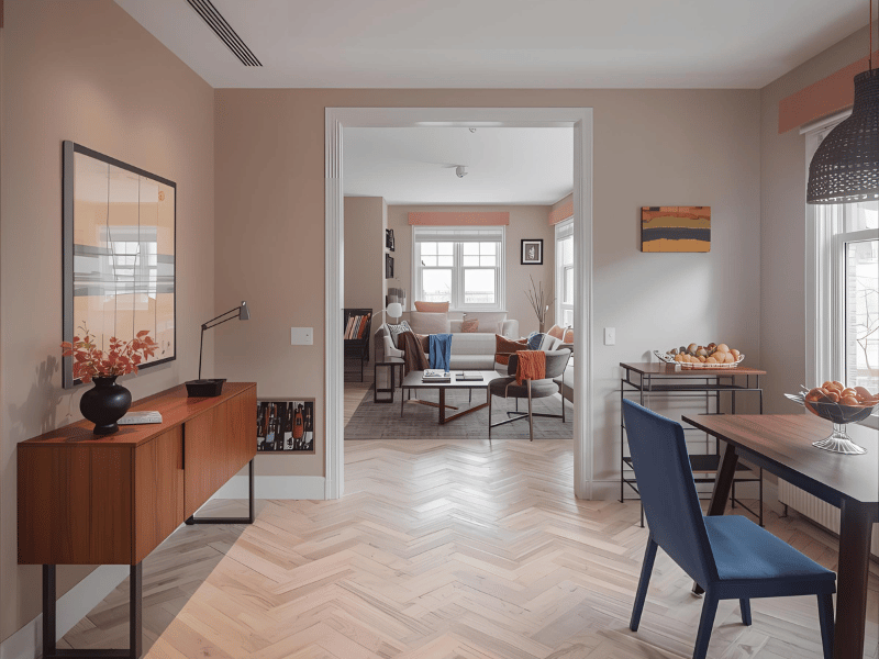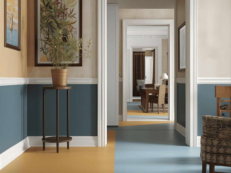 Two related colours can make compact rooms feel larger. Keep the centre lighter and the perimeter slightly deeper to create visual depth. In narrow rooms, place broad bands across the short side to widen the view. The method is simple to mark out with tape and suits rented homes, where a subtle change can make a useful difference.