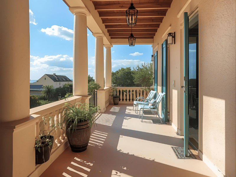 Open terraces call for UV-stable colours and dependable sealing. Pale stone, cool grey, and gentle green help keep the afternoon heat under control. Map activity zones before painting. A lighter centre for seating, a deeper rim for planters, and a clear path to the door bring clarity. The plan reflects a terrace floor paint design, where the terrace serves as a living space rather than just a service roof.