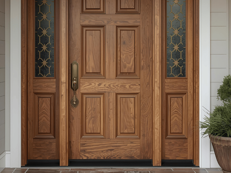 Teak brings friendly warmth that fits most elevations. Paint the frame and architrave in warm beige, then stain the leaf in teak. This neat contrast hides the everyday scuffs that frames collect and makes the leaf look rich without being dark. For apartments, this combination brightens lobbies. For villas, it ties in with garden greens and tan paving.