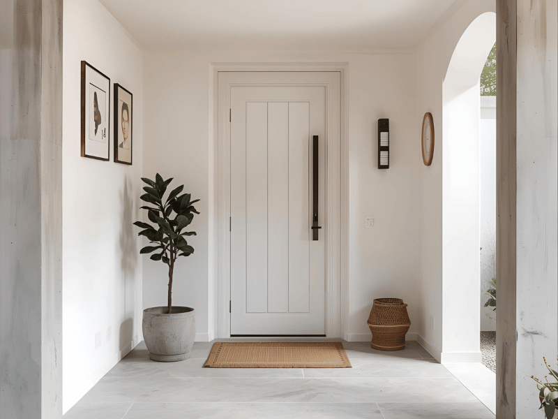 Soft taupe, putty, and warm greige create a quiet, polished entry. These colours are forgiving in dusty climates and they suit homes that use light stone or textured plaster. Keep accessories restrained. One planter with broad leaves, a simple bell, and a soft pool of warm light is enough. Minimal colours rely on proportion and detail, so ensure the handle and hinge positions are aligned neatly.