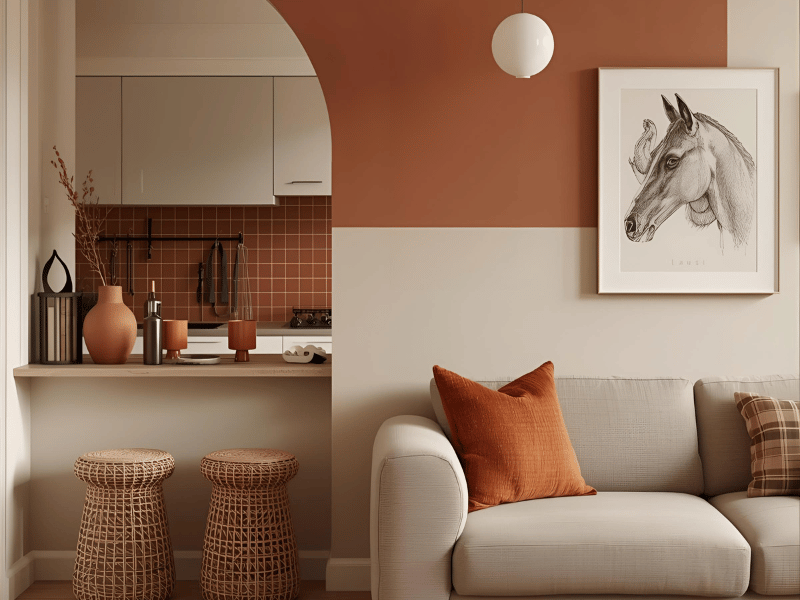 Beige brings easy warmth, while terracotta adds character. Use terracotta on a half-wall behind a breakfast counter or across a kitchen splashback tile. Layer with burnt orange textiles, pottery and cane stools. This mix is excellent for open-plan apartment decor where compact footprints benefit from cosy definition without heavy contrast.