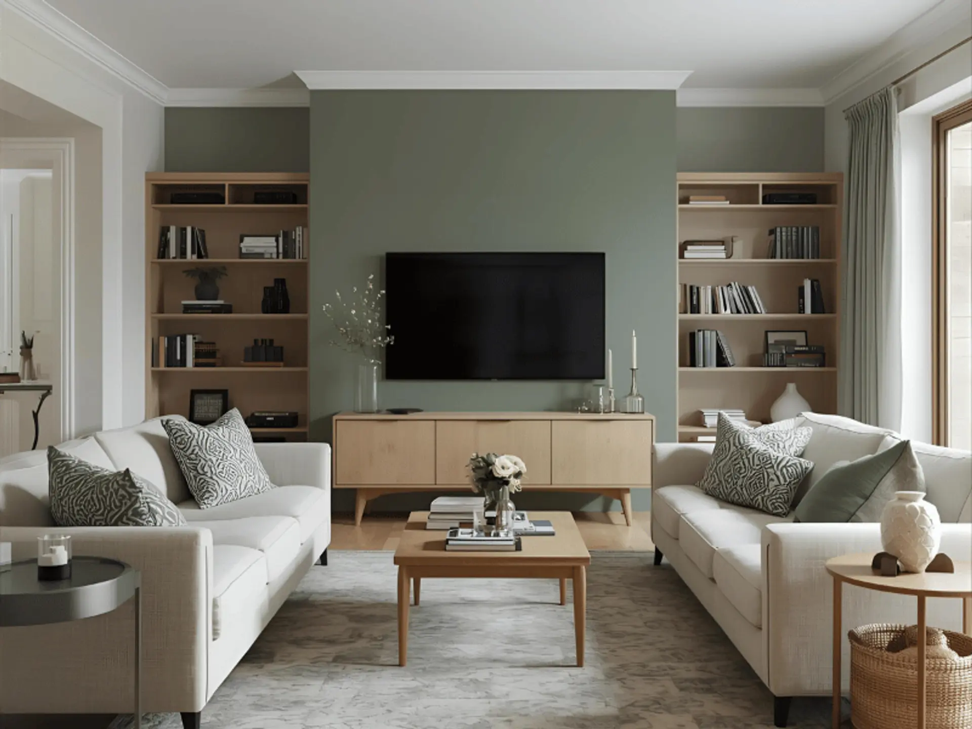 A soft grey base gives a calm canvas for a lounge or family area. Introduce sage green on the media wall or a low bookcase. Add eucalyptus-hued cushions and a patterned rug with a hint of green. Natural oak, rattan and brushed nickel complete the look. The result feels restful, ideal for reading or evening television.