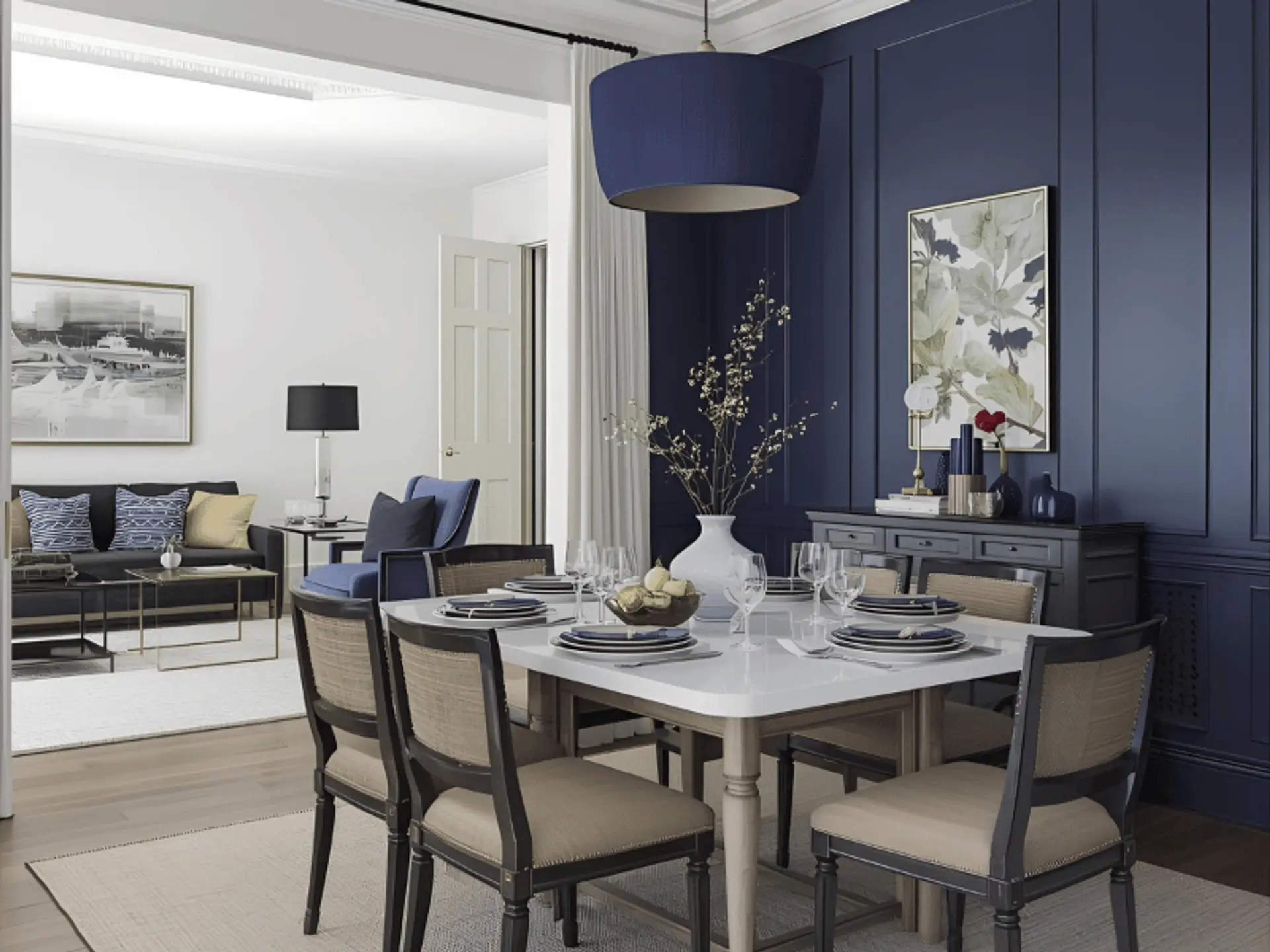 Warm white keeps the plan open while deep blue grounds the dining zone. Paint only the wall behind the table or use deep blue panelling up to chair rail height. Tie it together with indigo napkins, ceramic plates with blue rims and a pendant with a midnight shade. This pairing supports open floor plan living room decor where the lounge stays light but dining feels composed.