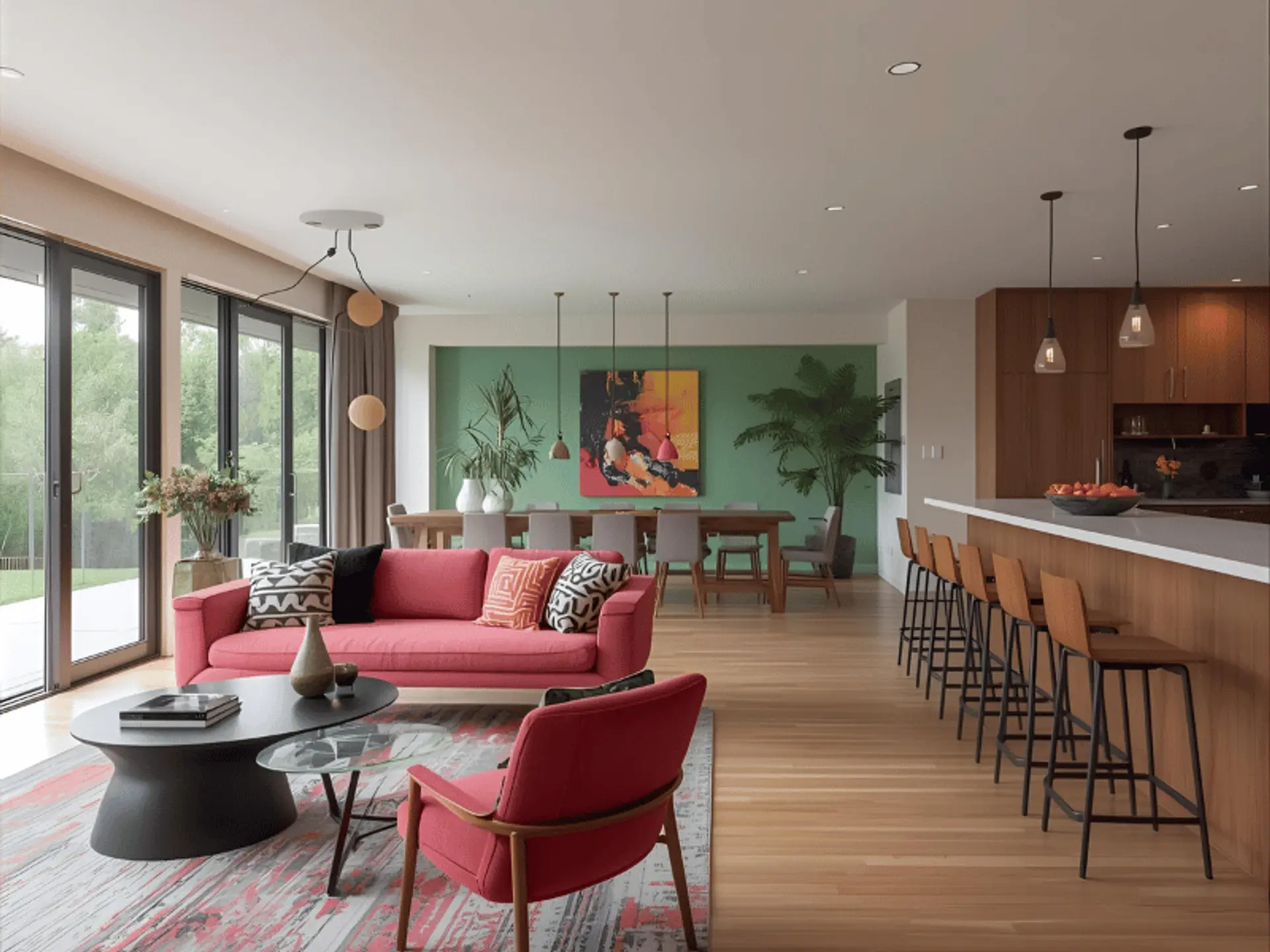If you often search for colors for open floor plans, you will see a wide range of suggestions. The best approach is to choose accents that sit one or two steps richer than your base on the same undertone path. A cool base like green, blue or charcoal. A warm base like terracotta, rust or olive. Repeat the accent in small amounts so the zone reads clearly from any angle.