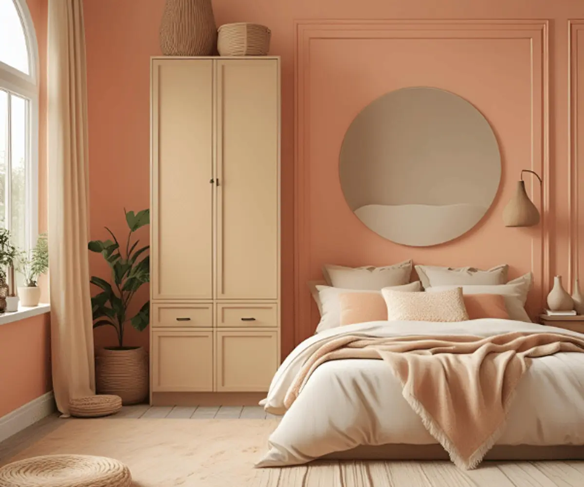 - Pastel yellow wardrobes or bedsheets against a peach wall