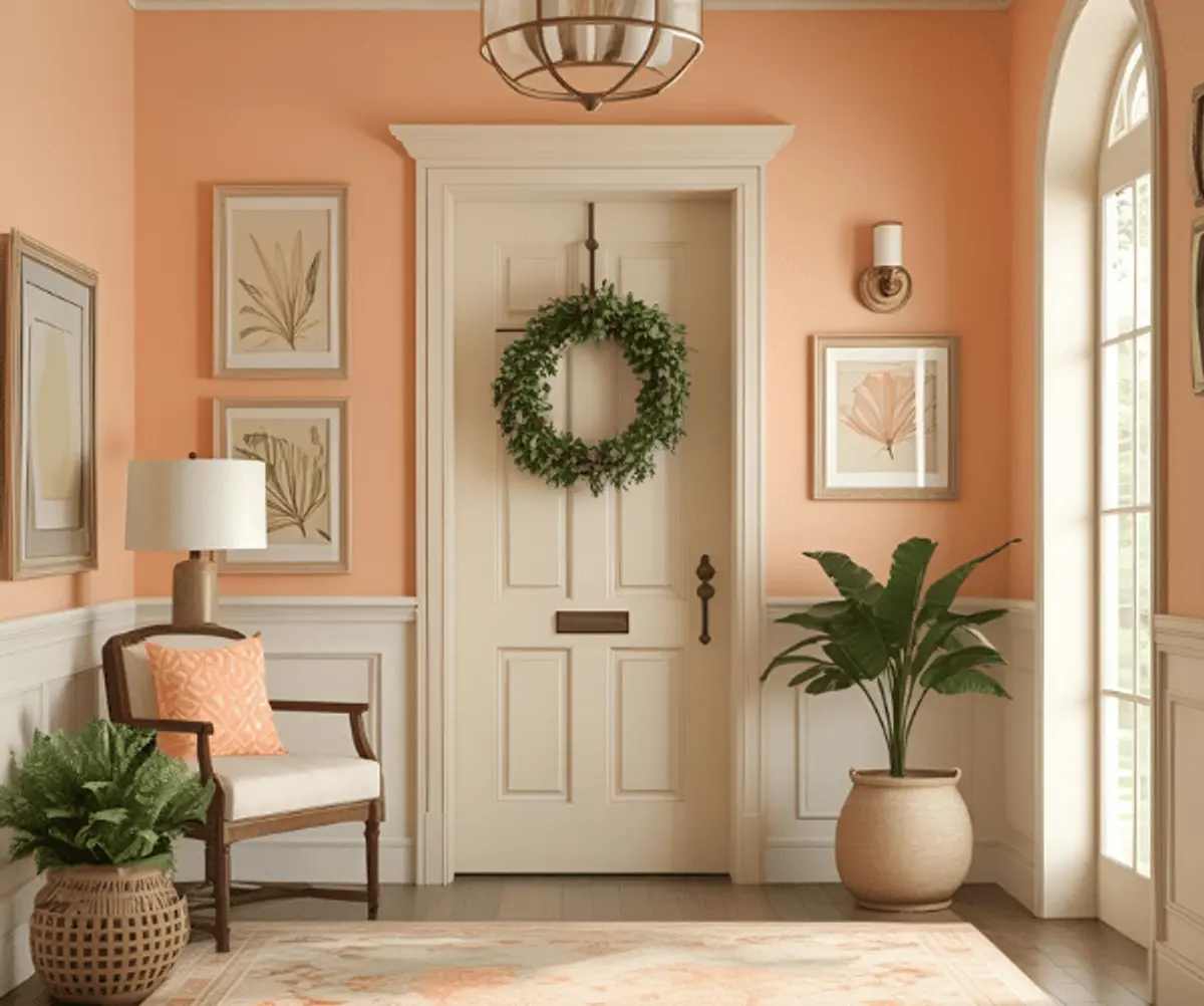 - Coral curtains or rugs in a peach-painted living room