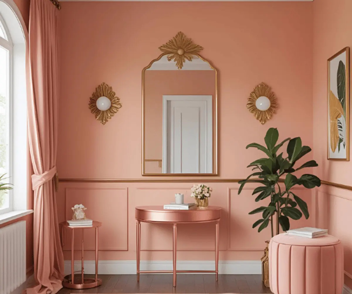 A Peach colour combination for wall with metallic accents makes a room look luxe. No matter how much you like classic gold or the simpler rose gold, both look fabulous against a peachy hue.