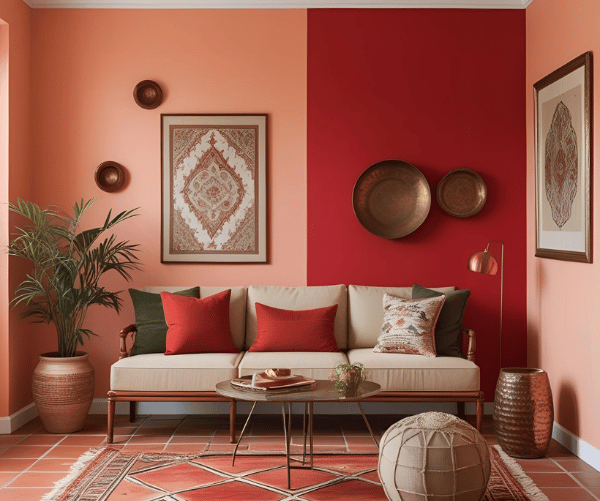 This peach colour combination for wall works well in festive living rooms or as a statement piece in a corner.