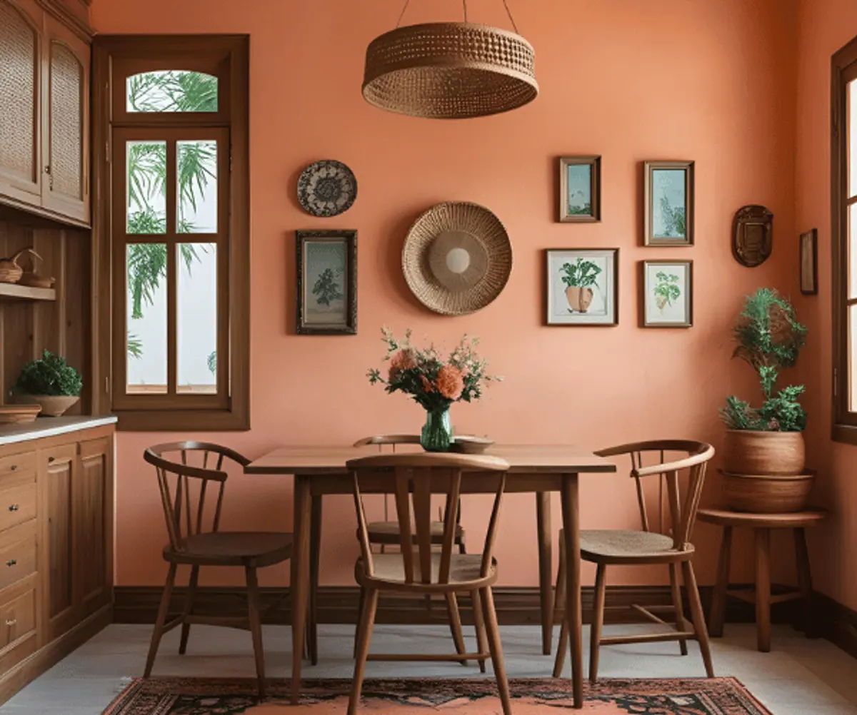 For those who want something more grounded and rich, a dark peach colour combination for walls works well with wooden interiors. This is ideal for rooms where you want to add warmth and weight.