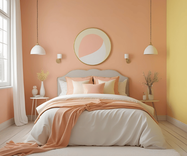 A soft and cosy combination, the peach two colour combination for bedroom walls, including pastel yellow, can feel like a warm hug.