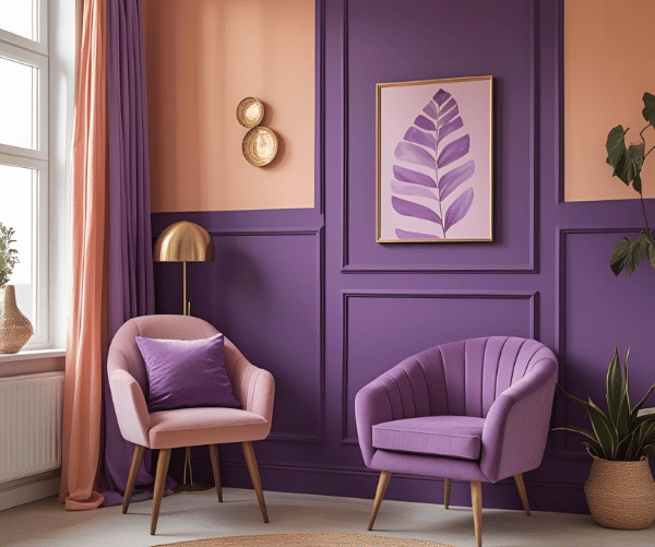 For a bold and artistic look, go for the peach and purple combination wall setup. The rich tones of purple give structure, while peach softens the mood.