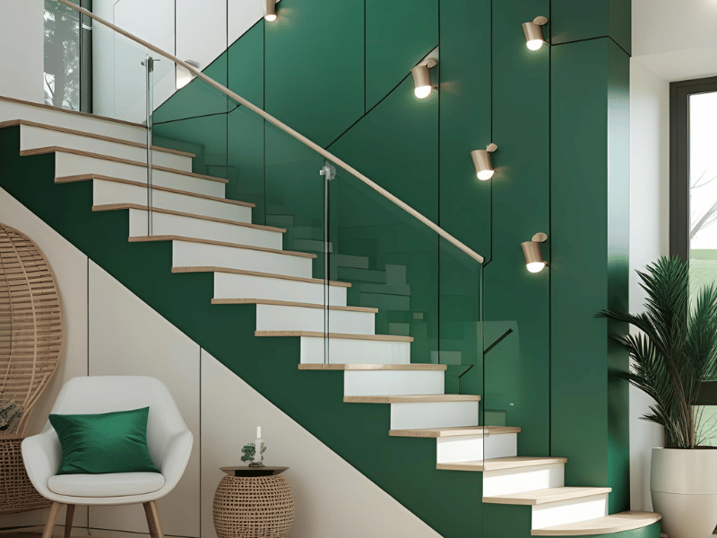 Use stair colour ideas that match not only the walls but also the staircase material—be it wood, iron, tile, or glass.