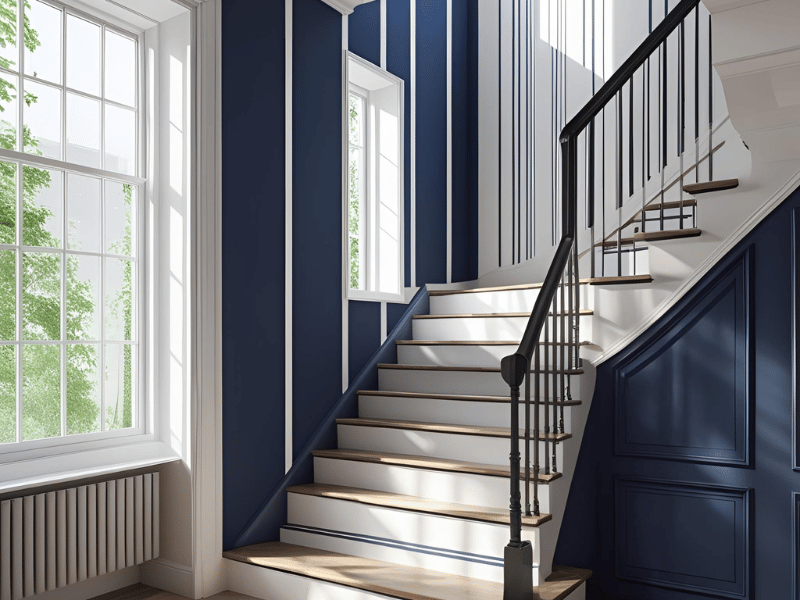 One of the most elegant combinations for staircase walls. Navy blue offers richness, while white lightens the overall look.