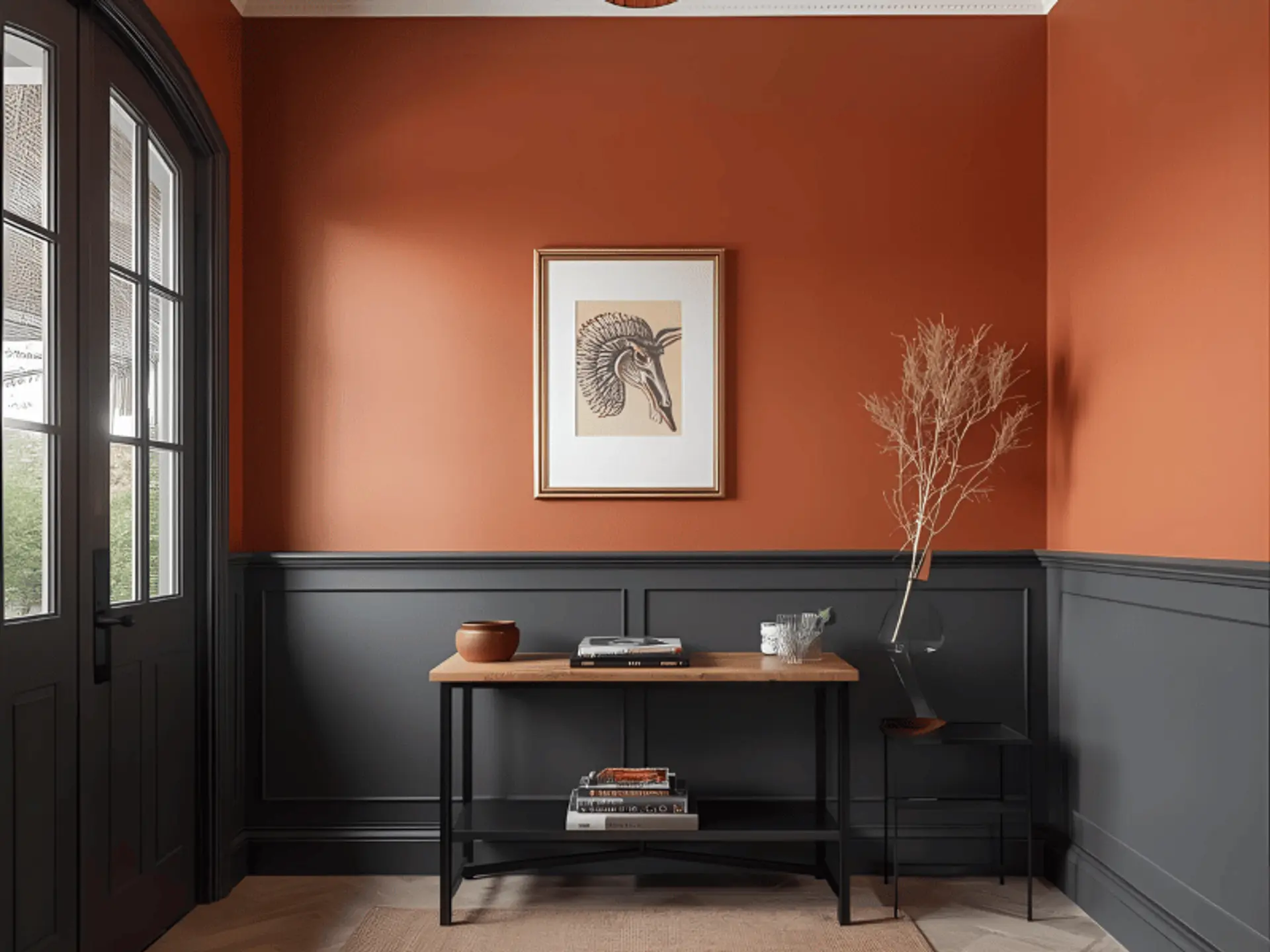 Deep notes like dark terracotta or a restrained terracotta red paint add theatre without overpowering the space.